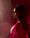 The "Sindoor" blouse features exquisite Indian handwork with a delicate golden gota border, creating a striking contrast. Paired with a red chaniya adorned with intricate gota border lines, it exudes elegance. The ensemble is completed with a chinnon dupatta embellished with golden buttis and a matching golden border, adding a touch of glamour and sophistication.